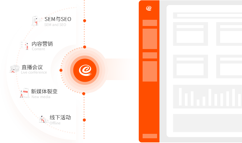 集成搜索引擎SEM、SEO、內容營銷、直播、新媒體裂變、線下活動等營銷工具,助力企業大數據獲客;
